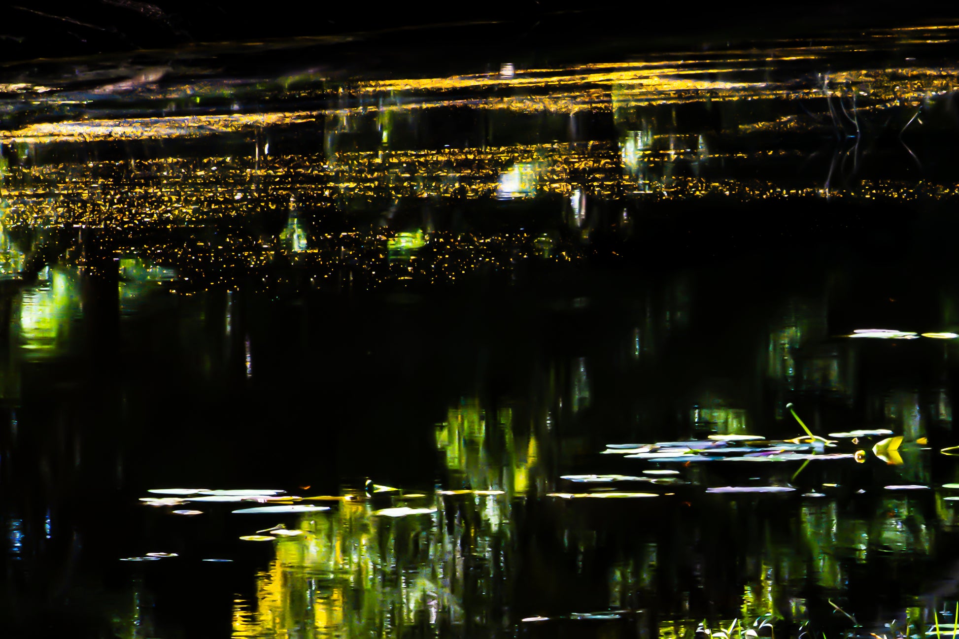 All That Glitters may not be gold, but it radiates with profound beauty. This daring artwork captures a wondrously serene moment—scattered petals afloat across a black mirror pond, punctuated by the luminous reflections of backlit trees on a warm autumn afternoon. Deep, expansive dark tones pulse with unexpected golds and greens, creating a composition that both illuminates and cools simultaneously. Lose yourself in the interplay of light and shadow, where nature's fleeting elegance becomes something transcendent and unforgettable.