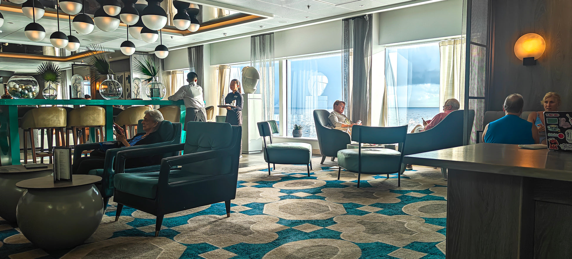 Captured Dayhawks in the Lounge on my phone because all cameras come with phones these days. It happened one morning in the coffee lounge of the Celebrity Beyond on a beautiful Caribbean cruise. The moment I saw the photo on my phone I knew it would become my homage to Edward Hopper's Nighthawks in the Diner.