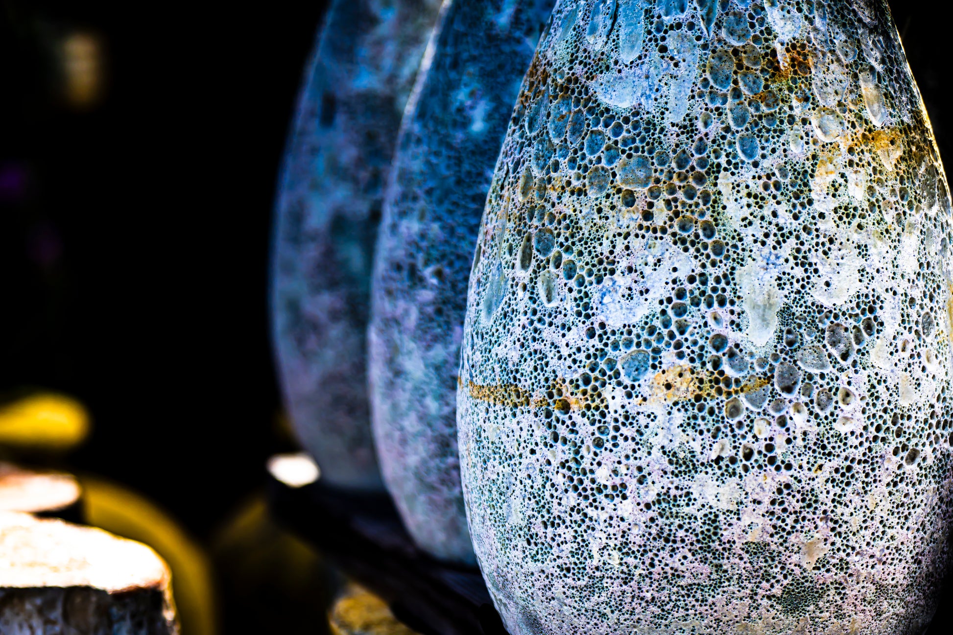 Moons of Johnny Mangos transforms ceramic vessels into celestial bodies adrift in the black vacuum of space—a vibrant still life that defies the boundaries between earth and cosmos. Large pots finished as lunar landscapes seem almost alive with three-dimensional textures and shadows. This is artwork that doesn't merely hang on a wall; it captures and radiates the ambient light of any room, bending it to its will. The result: strangely uplifting, unexpectedly inspirational, a visual anchor that reminds you the universe exists both beyond and within the spaces we inhabit. Compelling, vibrant, unforgettable.