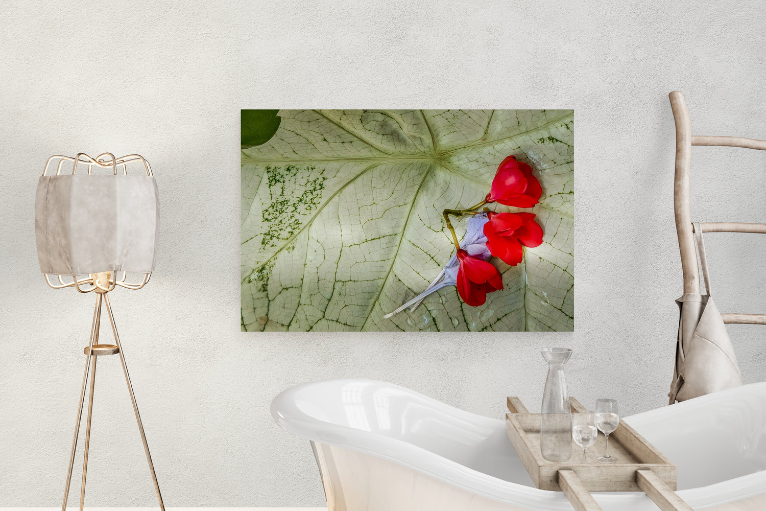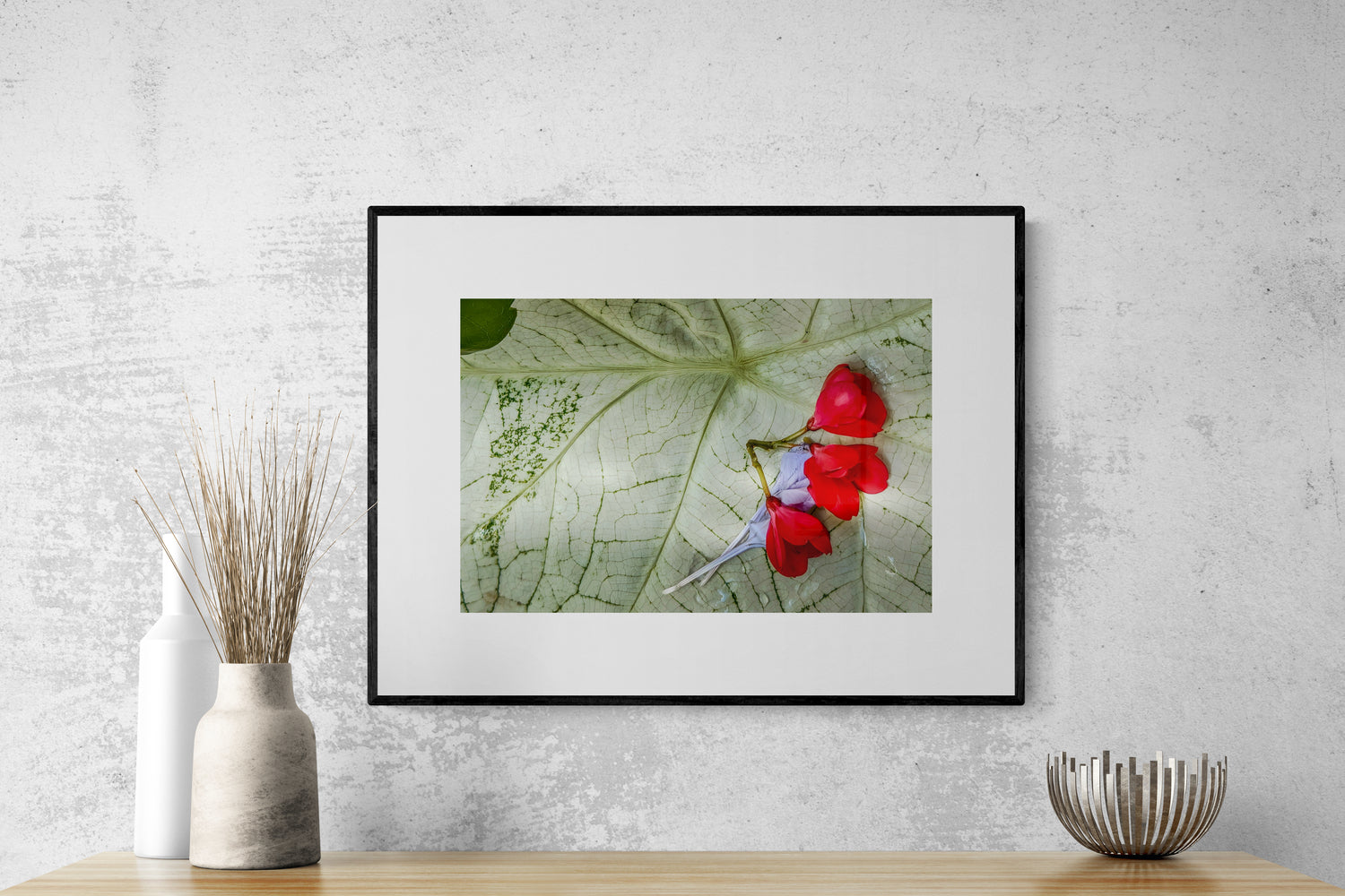 Tearful Last Embrace captures a delicate moment in time as fallen jatropha blossoms gently embrace a wilted plumbago flower atop a caladium leaf after a heavy tropical rain. This wonderfully evocative work of art blends beauty and melancholy, inviting you to reflect on nature’s fleeting grace. Don't we all long for a loving embrace at times? Don't we all long on occasion to comfort others? Don't we all want a soft place to land in troubled moments? Tearful Last Embrace will imbue any space in your home with a touch of poetic grace and pathos.