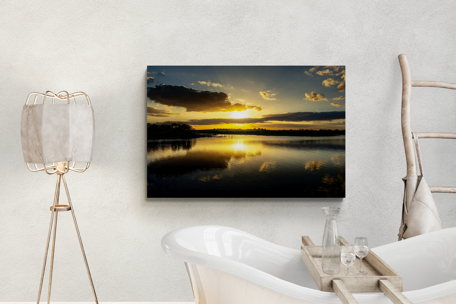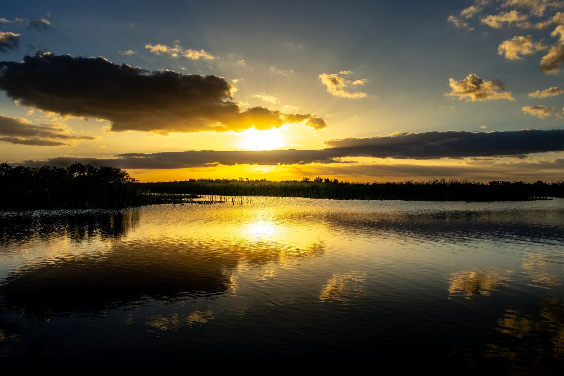 Witness the breathtaking beauty of the Loxahatchee sunset with this stunning photograph, the last of five in my Chronology of a Sunset Suite, captured on April 30th, 2025 at 7:28pm as the final act of the Loxahatchee sunset unfolds in a stunning display of golds and blacks equally at home in the sky and water. The majestic drama of the Loxahatchee sunset over the northern Everglades draws spectators from all over the world -- for obvious reasons. Bring home a piece of this awe-inspiring natural wonder and feel your heart and soul expand every time you look at it. Let its vibrant warmth transform your space.