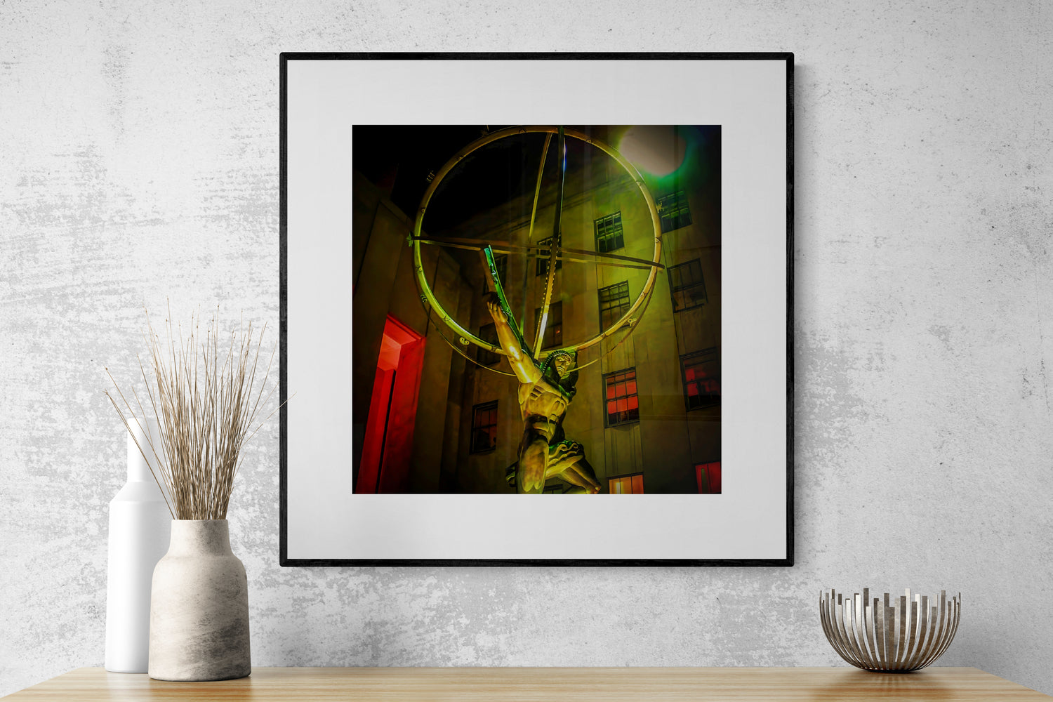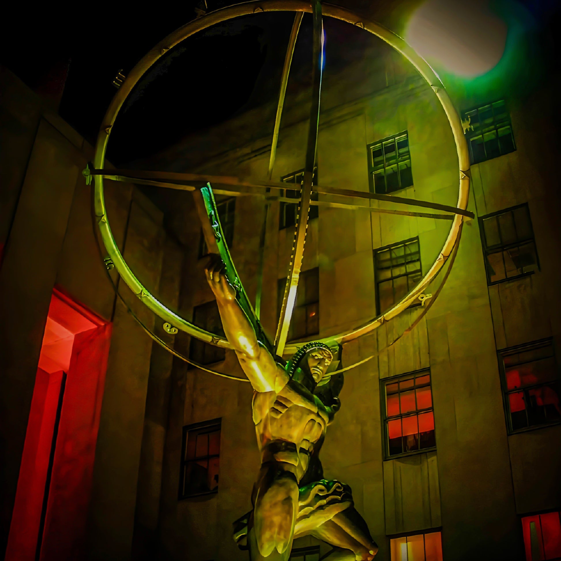 Cast in 1937, this magnificent bronze Atlas hoists the world atop his shoulders in NYC's Rockefeller Center. Perfectly captured on Christmas Eve in this striking work of art, it's easy to see why this art deco giant has inspired generations of Ayn Rands and Diego Garcias alike. A perfectly dramatic statement piece for any modern decor, Atlas Shrugging is a monument to power and fortitude and resilience that will elicit astonished gasps from those who behold it.