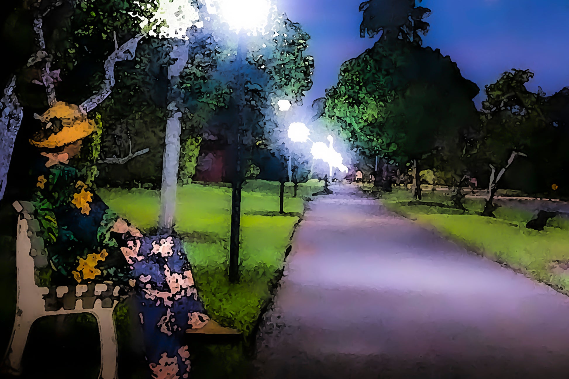 Paris Moon Over Delray Beach is what happens when a full moon over Paris suddenly decides to vacation in Delray Beach, Florida. This delightfully captivating night scene unfolds like an impressionist watercolor: your eye settles first on a lovely lady in tropical florals, then meanders down a brightly illuminated path bathed in the ample glow of street and lunar light—a scene easily transposed (apart from the palms) to any autumn night in any gay Parisian park.