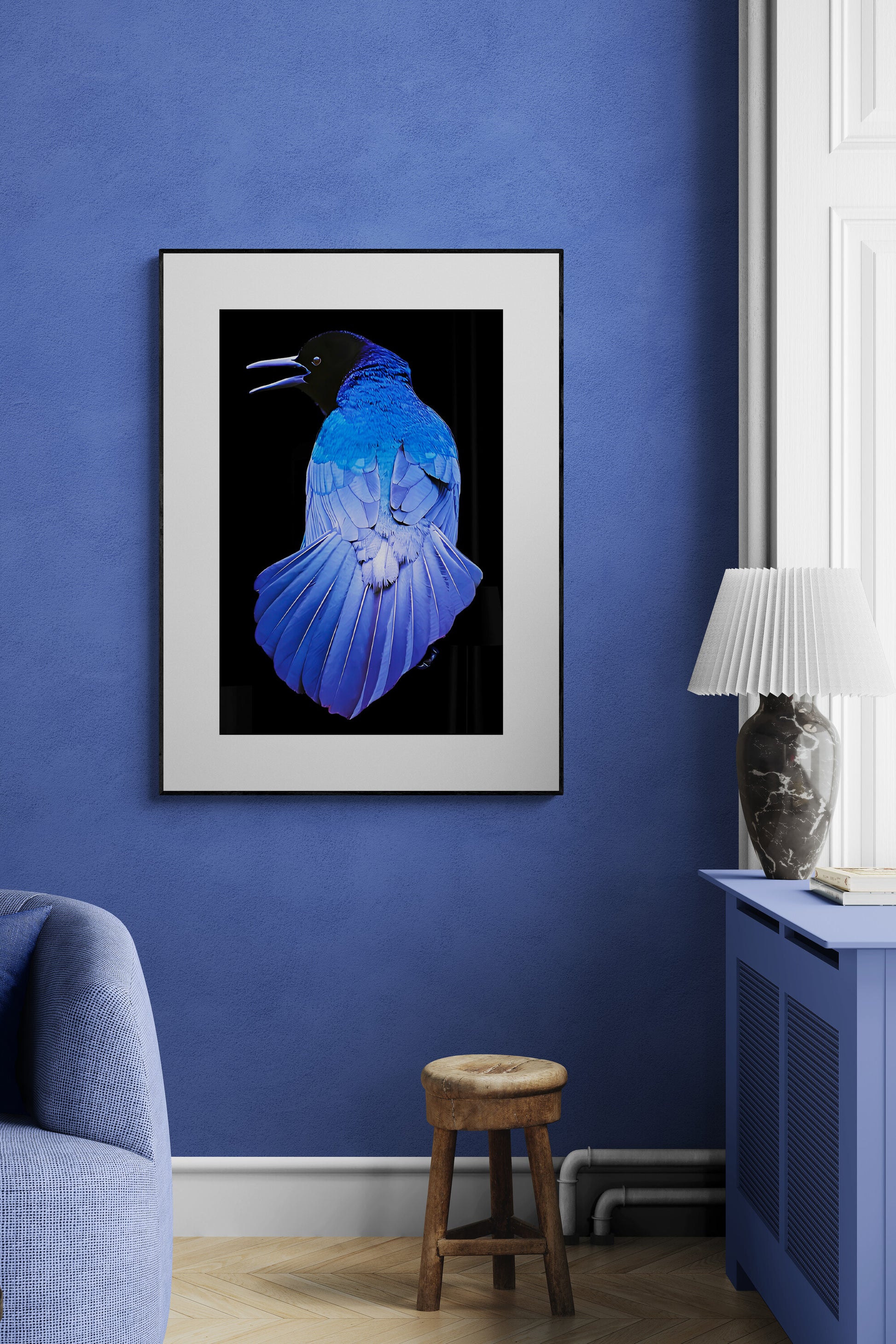 The common boat-tailed grackle in this striking work of art is anything but. It sits in radiant blue tones against a luxurious jet black background. A magnificent showpiece for any decor, Uncommon Grackle on Black will fill all who behold it with awe and wonder.